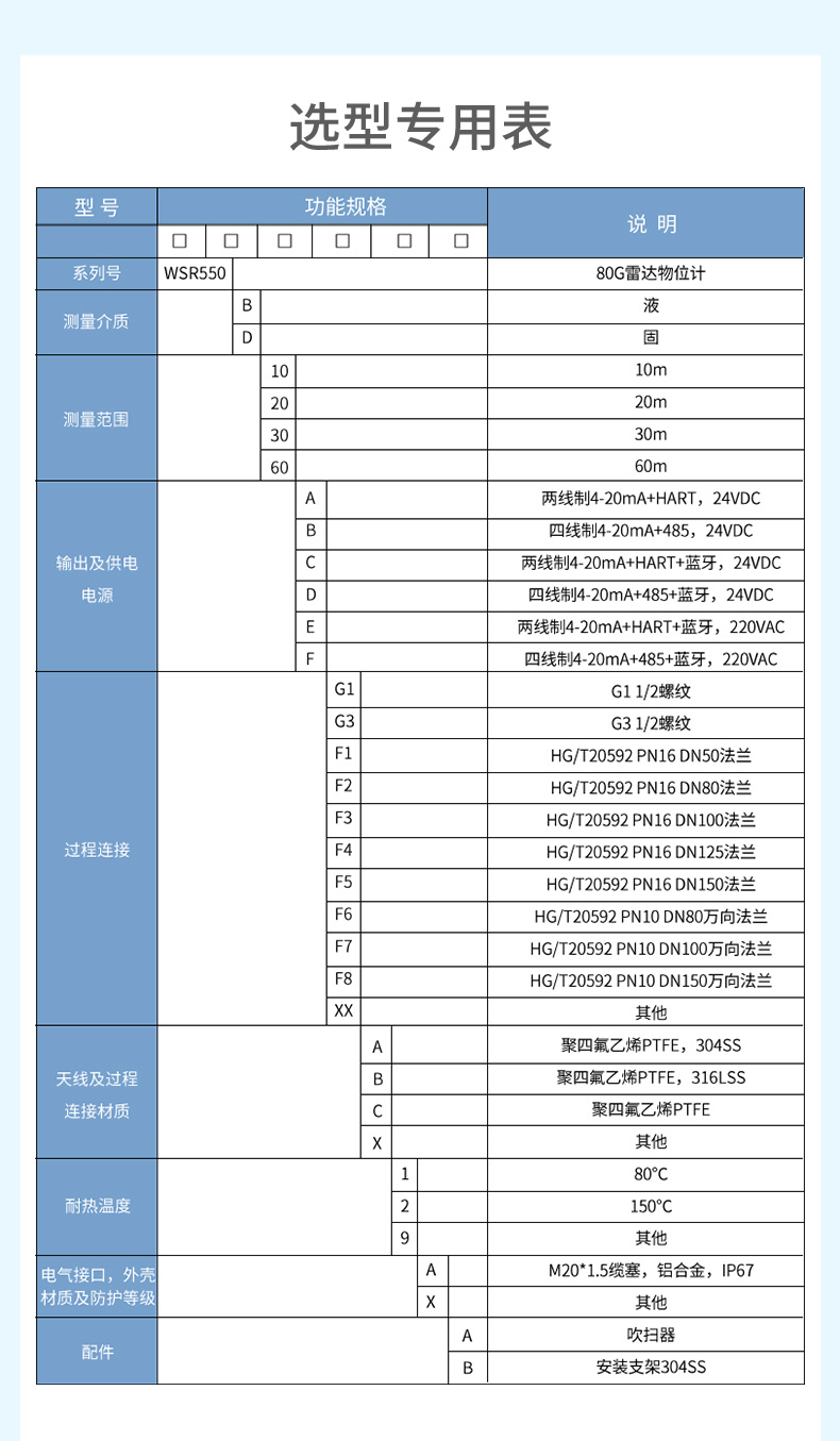 聯(lián)測(cè)儀表WSR550雷達(dá)液位計(jì)(76~81)GHz 系列產(chǎn)品,是指工作在(76~81)GHz 的調(diào)頻連續(xù)波 (FMCW)雷達(dá)產(chǎn)品,支持四線(xiàn)制和兩線(xiàn)制應(yīng)用。產(chǎn)品有多個(gè)型號(hào),量程可達(dá) 60m,盲區(qū)可以做到8cm。由于它工作頻率更高,波長(zhǎng)更短,所以尤其適合固體應(yīng)用,通過(guò)透鏡發(fā)射接收電磁波的工作方式,在高粉塵,惡劣溫度環(huán)境下(200℃)具有獨(dú)特的優(yōu)勢(shì)。儀表提供法蘭或者螺紋的連接方式,使得安裝便捷簡(jiǎn)易。
